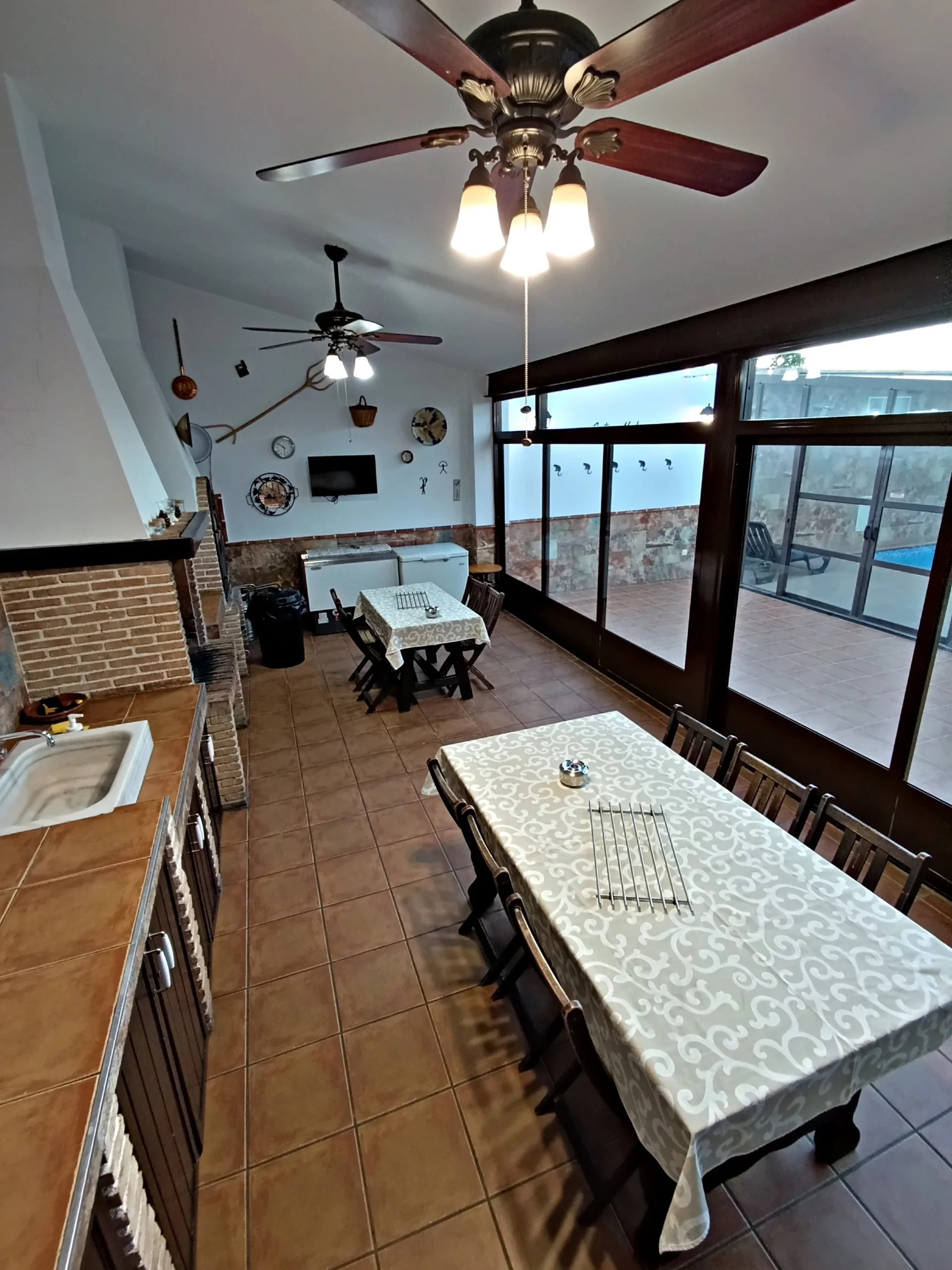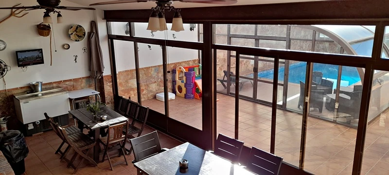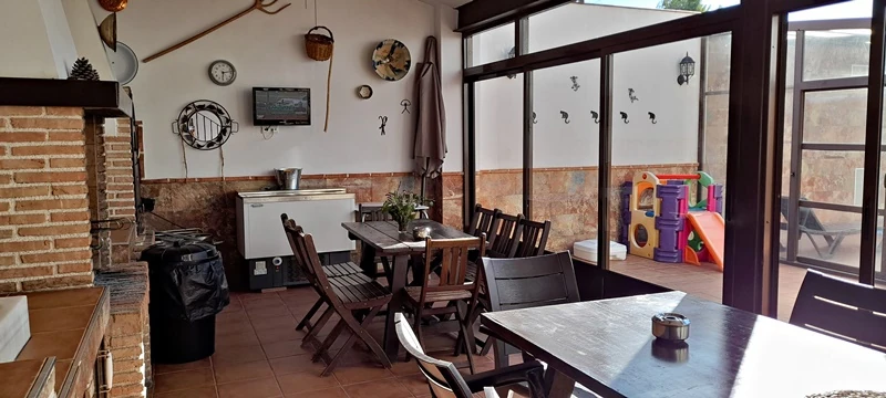 Comedor acristalado con horno de leña en Cortijo Alcibara