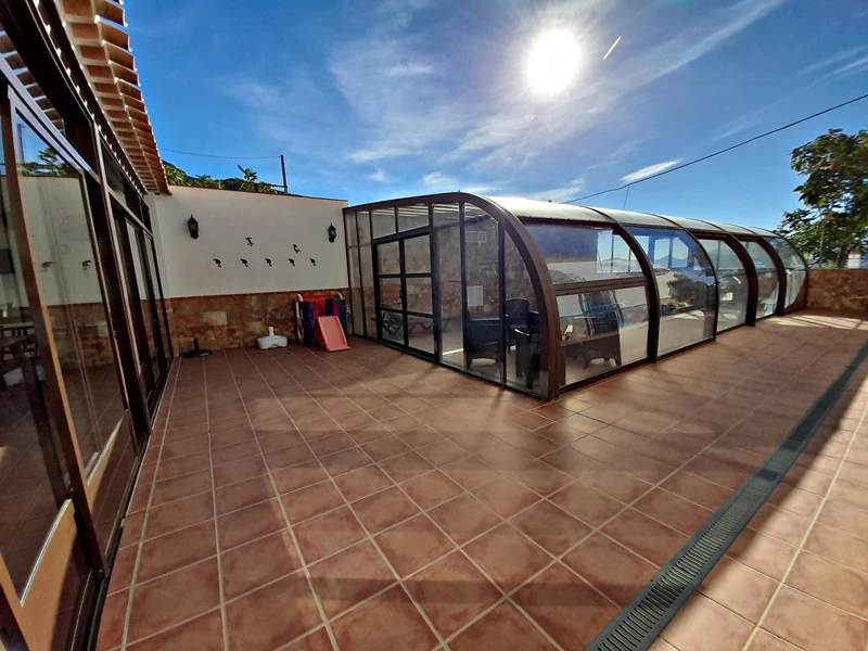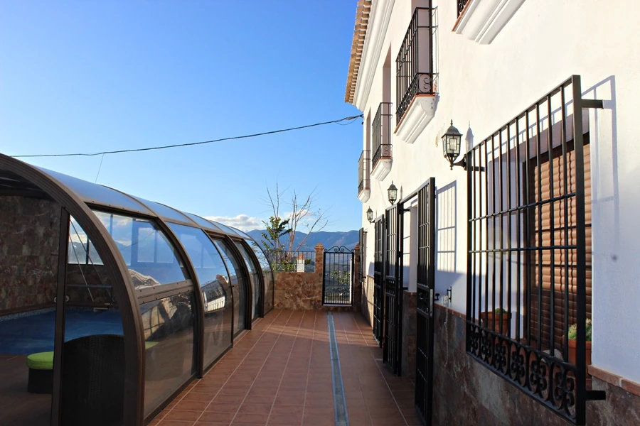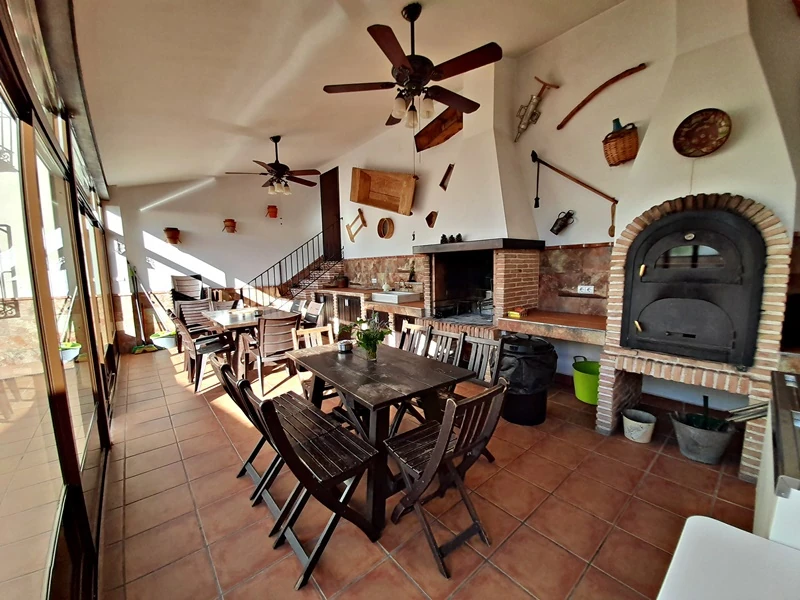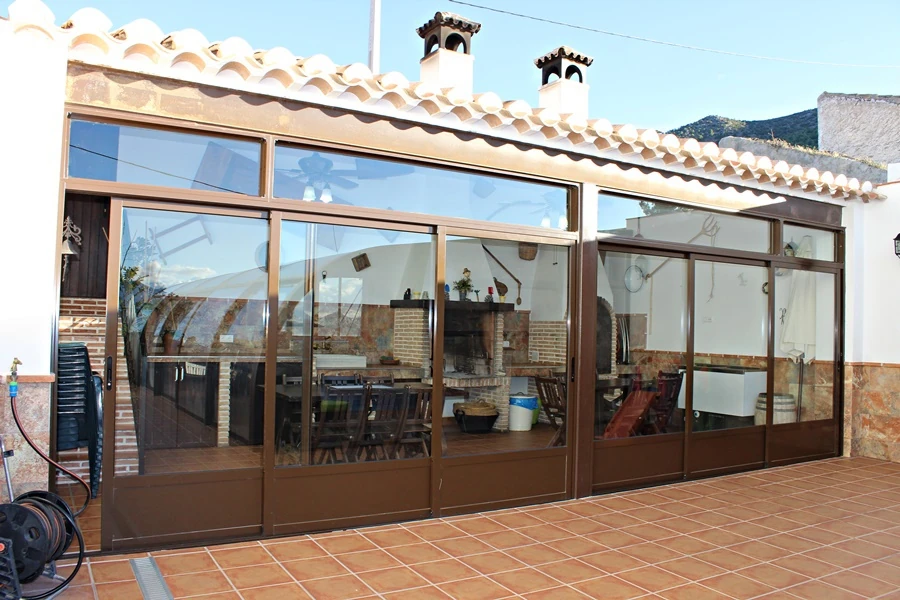 Comedor exterior acristalado con horno de leña del Cortijo Alcibara, Vélez Rubio